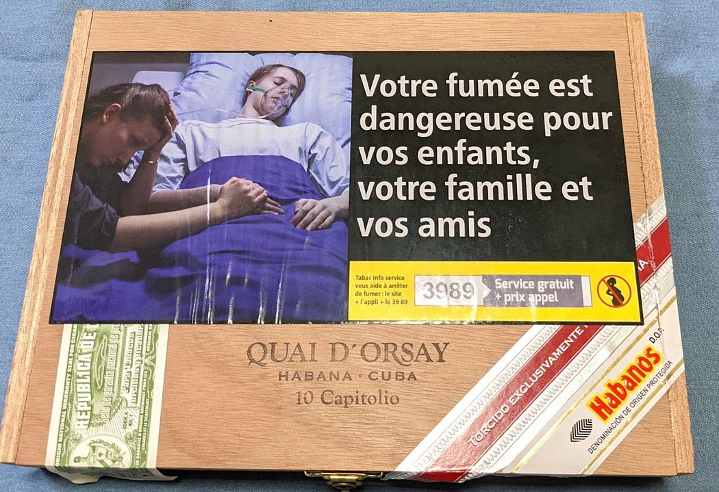 開啟這股風潮幾十年後,各國政府越是「食髓知味」,香菸盒裝上有「健康警語」,雪茄盒上也必須貼附,所費不貲買上一盒精美的雪茄,上頭貼著讓人感到噁心不舒服的圖文,卻不能報警檢舉。